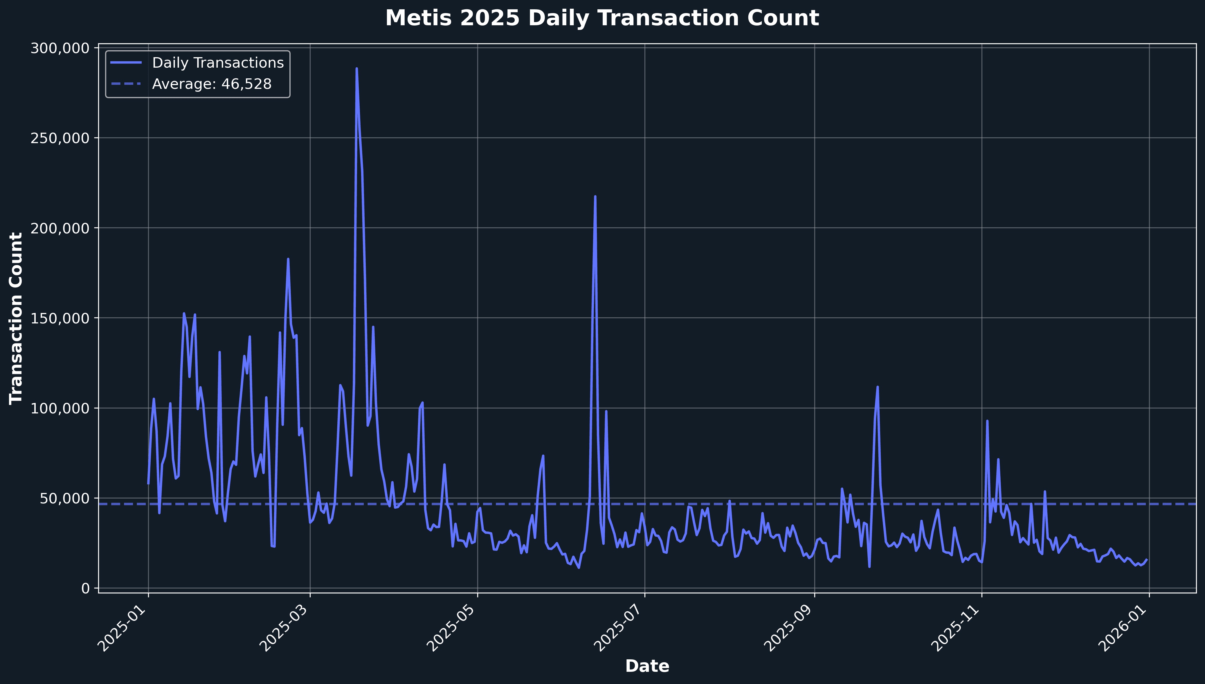 Metis demonstrated robust transactional activity throughout 2025, with an average of 46,528 daily transactions and peaks reaching 288,433. The year showed consistent throughput with notable activity spikes throughout the year, reflecting strong protocol usage and ecosystem engagement. Notable activity surges occurred during major ecosystem developments including DeFi Kingdoms PvP tournament launches, Aqualis Protocol launch, HyperHack events, and LazPad Open Launch. The network maintained resilience with daily transaction volumes consistently above 11,000, demonstrating Metis's capacity to handle diverse workloads from gaming applications like DeFi Kingdoms to DeFi protocols and AI-native infrastructure. This sustained activity aligns with the network's expanding role in AI-blockchain integration, where projects like LazAI, CreateAI, and GMPayer leverage Metis's low fees and fast finality for onchain AI operations.