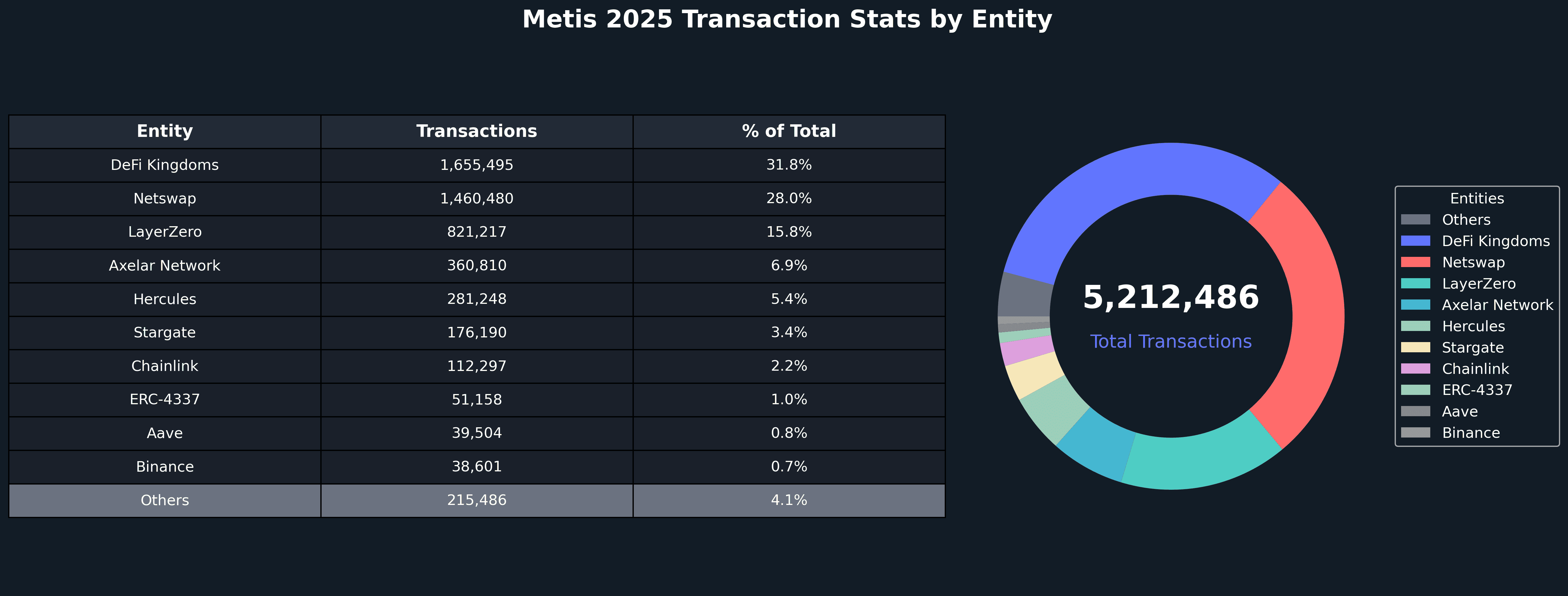 Metis's top entities by users and transactions highlight a diverse ecosystem anchored by gaming, DeFi, and cross-chain infrastructure. DeFi Kingdoms dominated transaction volume with 1.66 million transactions (31.8% of total), reflecting the platform's strong gaming presence on Metis. Netswap led DeFi activity with 1.46 million transactions (28.0% of total), while LayerZero and Axelar Network demonstrated significant cross-chain infrastructure usage. Axelar Network led in user activity with 212,451 unique users (58.4% of total), showcasing Metis's role as a cross-chain hub. The ecosystem's distribution reinforces Metis's dual role as both a high-performance gaming platform and a DeFi infrastructure layer, with cross-chain protocols serving as critical connectivity infrastructure for the expanding AI-blockchain ecosystem.